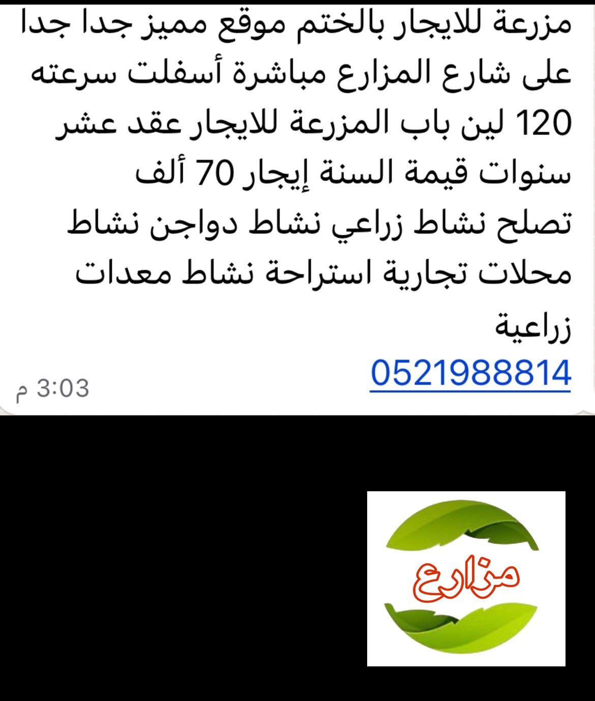 مزرعة للايجار بالختم موقع مميز جدا جدا على شارع المزارع مباشرة أسفلت سرعته 120 لين باب المزرعة للايجار عقد عشر سنوات قيمة السنة إيجار 70 ألف