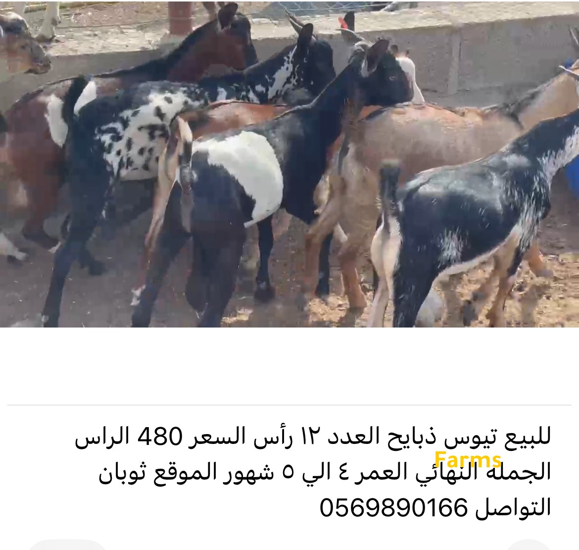 للبيع تيوس ذبايح العدد ١٢ رأس السعر 480 الراس الجمله النهائي العمر ٤ الي ٥ شهور الموقع ثوبان التواصل 0569890166