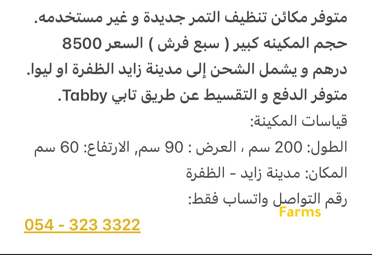 متوفر مكائن تنظيف التمر جديدة و غير مستخدمه. حجم المكينه كبير ( سبع فرش ) السعر 8500 درهم و يشمل الشحن إلى مدينة زايد الظفرة او ليوا. متوفر الدفع و التقسيط عن طريق تابي Tabby.