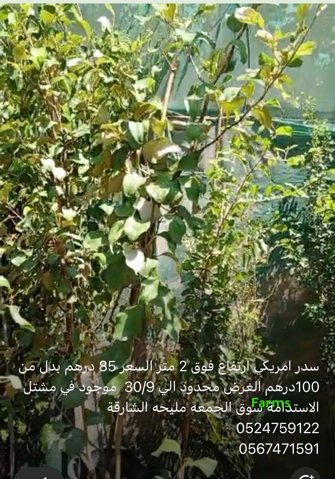 سدر امريكي ارتفاع فوق 2 متر السعر 85 درهم بدل من 100درهم الغرض محدود الي 30/9  موجود في مشتل الاستدامة سوق الجمعه مليحه الشارقة